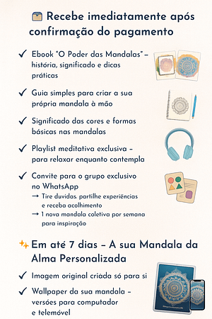 📘 eBook digital (PDF) com: – O que são Mandalas e o que é a Mandala da Alma – Contexto histórico e aplicações no dia a dia – Como criar mandalas intuitivas à mão – Significado das cores e formas básicas – 2 Mandalas universais para imprimir – Playlist com música para contemplação